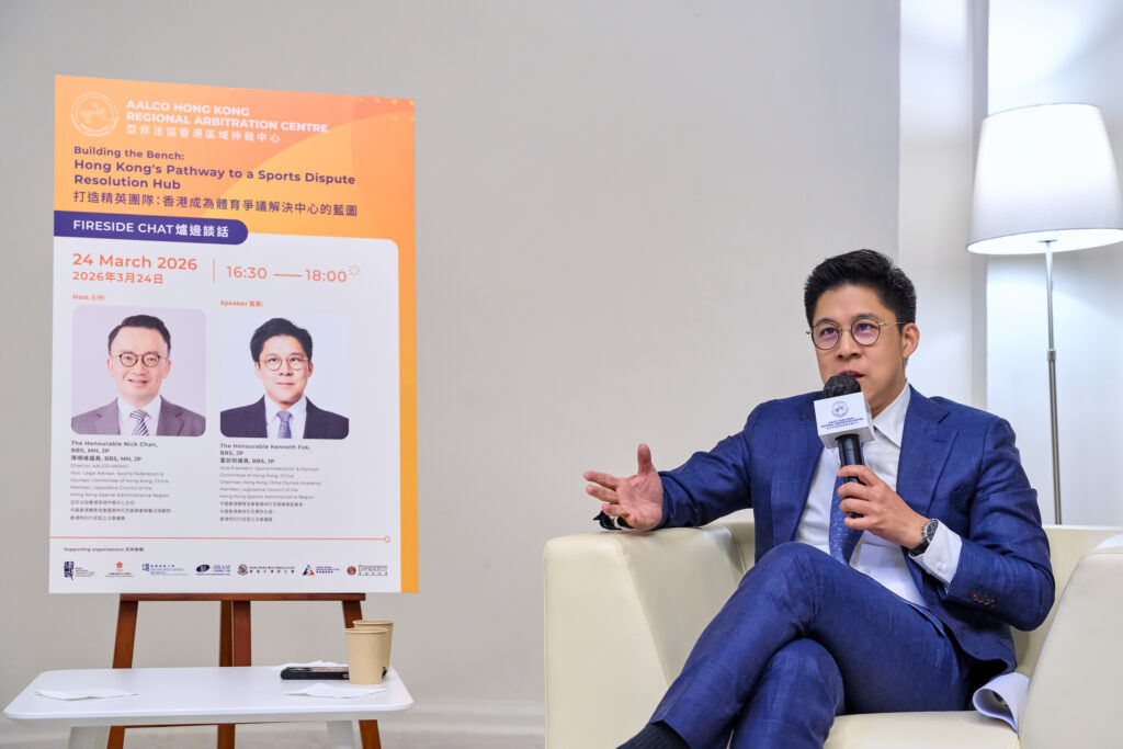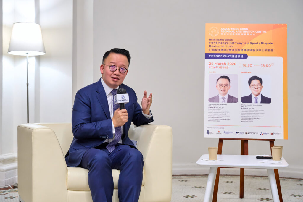 The AALCO Hong Kong Regional Arbitration Centre (AALCO-HKRAC) hosted a Fireside Chat on 24 March 2026 entitled Building the Bench: Hong Kong’s Pathway to a Sports Dispute Resolution Hub.” The event was chaired by the Honourable Nick Chan, BBS, MH, JP, Director of the AALCO-HKRAC, Honourable Legal Advisor to the Sports Federation & Olympic Committee of Hong Kong, China, and Member of the Legislative Council. The guest speaker, the Honourable Kenneth Fok, BBS, JP, Vice President of the Sports Federation & Olympic Committee of Hong Kong, China; Chairman of the Hong Kong, China Olympic Academy; and Member of the Legislative Council, shared his insights drawn from observations during the “Two Sessions” and his extensive experience in sports governance.